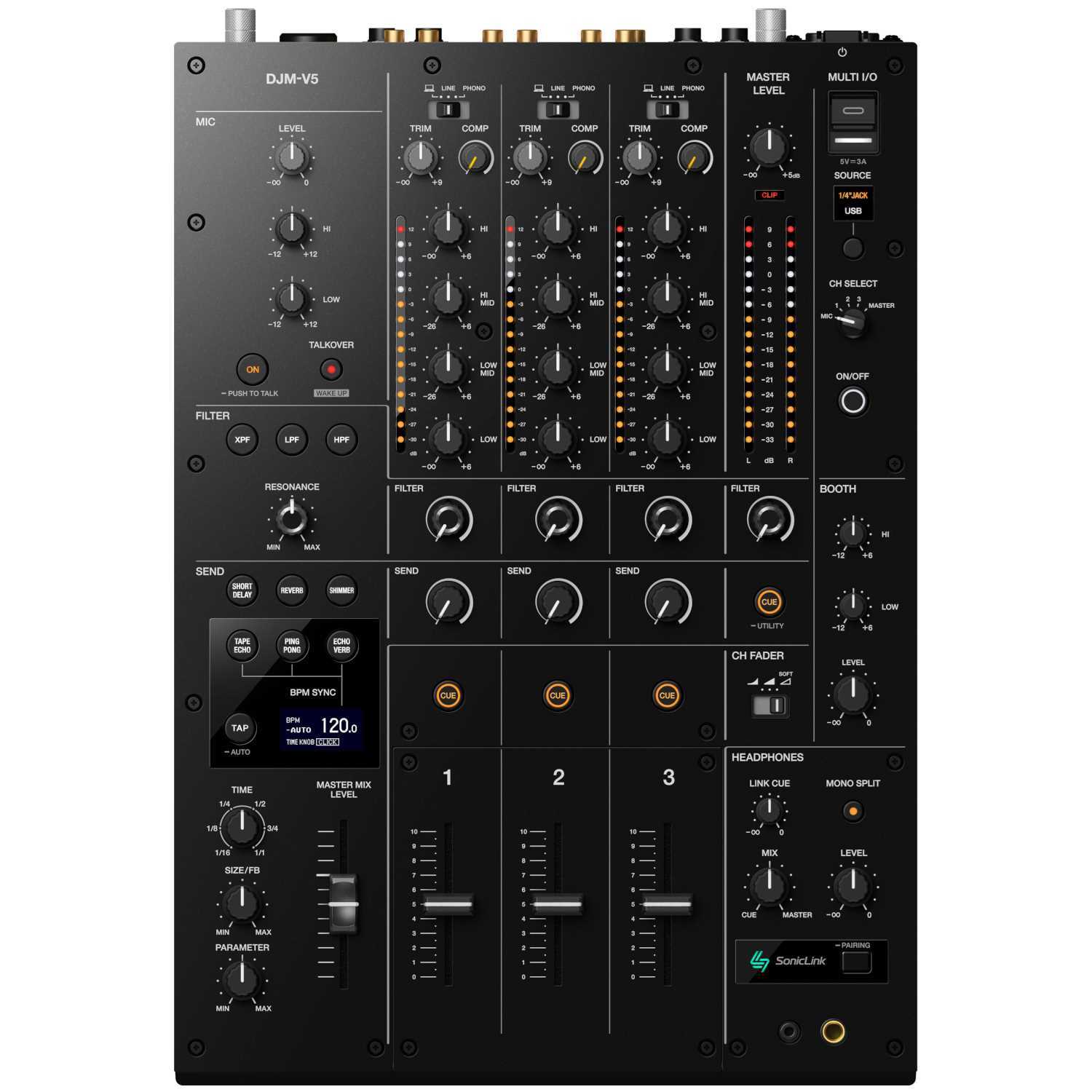 DJMV10 är en professionell 3-kanals DJ-mixer från Pioneer med väldigt hög ljudkvalitet, 4-bands EQ, 6 Send FX-typer, 34 filtertyper, samt inbyggt 24 bit/96kHz USB-ljudkort.