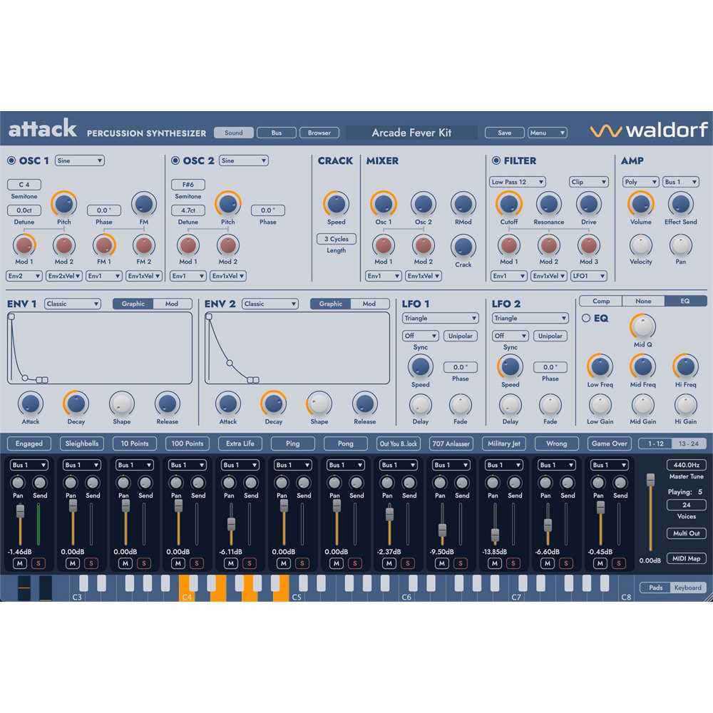 Från slagkraftiga kickar till melodisk percussion – Attack 3 är Waldorfs percussion-synt byggd för rytm. Den drivs av en mäktig virtuell analog syntljudgenerator och valfria samplingar som fångar det omisskännliga klassiska ljudet från legendariska analoga trummaskiner från 1980-talet samt de drivande elektroniska klubbbeatsen från 1990-talet. Med Attack 3 förs detta arv vidare in i dagens produktioner.