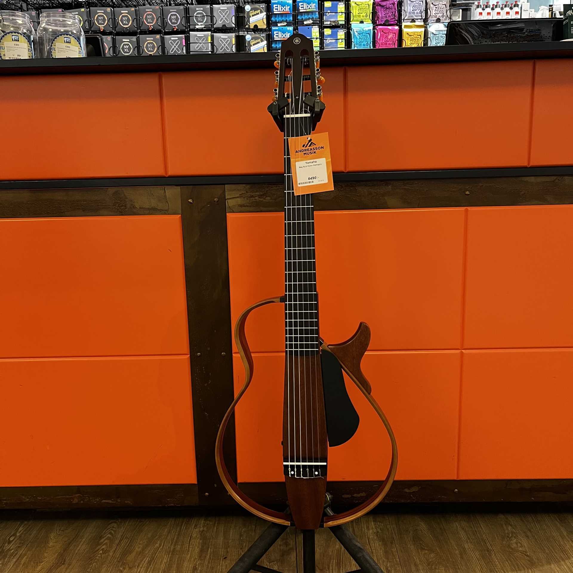 Begagnad Yamaha Silent Guitar med nylonsträngar, perfekt för tyst övning eller förstärkt spel. Extremt smidig design med avtagbar ram och naturligt, balanserat ljud via SRT-mikrofonsystemet.
